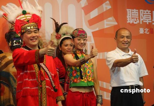 图为在台北市长官邸艺文沙龙举办的推介会上,身穿台湾少数民族服装的台北市长郝龙斌(左)与杨丽萍(右二)共学哑语。中新社发 耿军 摄