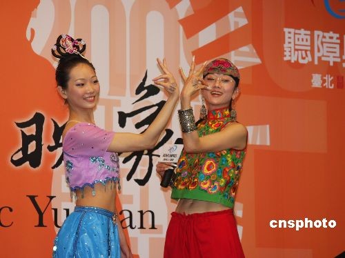 图为在台北市长官邸艺文沙龙举办的推介会上,一位酷爱舞蹈的台湾听障女孩(左)向孔雀公主杨丽萍(右)请教孔雀舞的指法。中新社发 耿军 摄