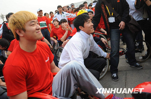 4月12日,刘翔(中)在长跑节活动现场与参赛选手合影。当日,2009北京国际长跑节在天安门广场启动。罗晓光 摄