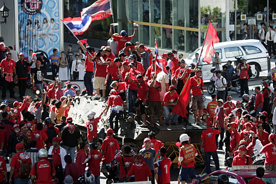 4月12日下午,泰国反政府示威者(红衫军)冲入泰国内政部并与警方发生冲突,数人受伤。泰国总理阿披实当日下午突然发表电视讲话,宣布在首都曼谷及周边地区实施紧急状态法,责成副总理素贴全权处理安全事务。