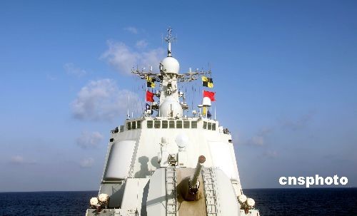 当地时间4月13日清晨6时许,中国海军第一、第二批护航编队顺利会师亚丁湾。 中新社发 孙自法 摄