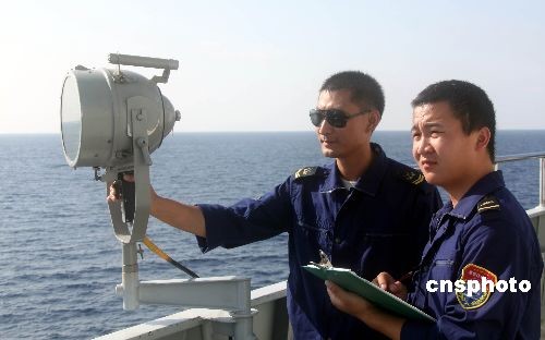 当地时间4月13日清晨6时许,中国海军第一、第二批护航编队顺利会师亚丁湾。图为“海口”舰与第二批护航编队战舰通过灯光信号互致问候。中新社发 孙自法 摄