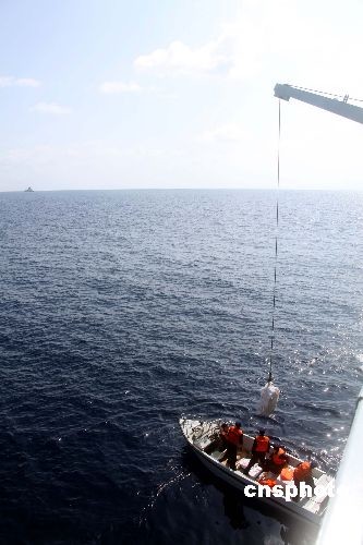 当地时间4月13日清晨6时许,中国海军第一、第二批护航编队顺利会师亚丁湾。图为两批护航编队会合后,“黄山”号导弹护卫舰派快艇运送一批肉类副食物资补给到“海口”号导弹驱逐舰上。中新社发 孙自法 摄