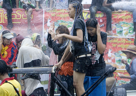 4月13日,缅甸仰光街头,年轻人在参加“泼水节”活动。