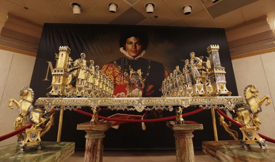 迈克尔杰克逊的一套国际象棋在展台上进行展示。