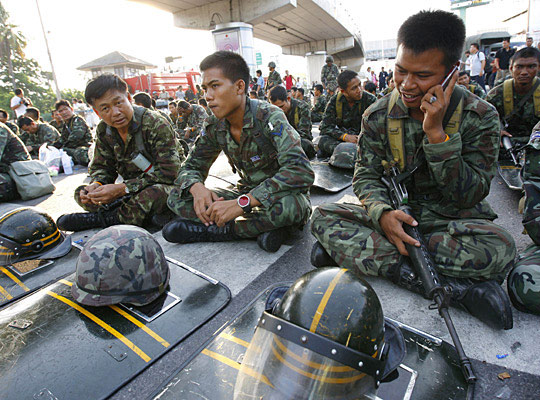 泰国士兵在休息时打电话。