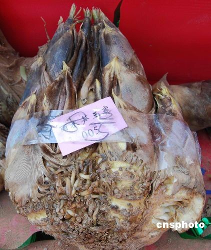 图中胸围达77.5厘米、重20.04公斤的大笋日前在丽水毛竹(笋)王擂台赛上摘得“桂冠”。中新社发 王旻 摄