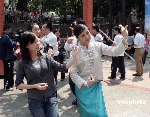 东盟留学生与中国大学生、在场嘉宾一同跳起团圆舞,共庆泼水节的到来。中新社发 黄艳梅 摄