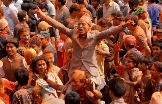 组图:尼泊尔群众互相抛洒粉末庆传统新年(4)