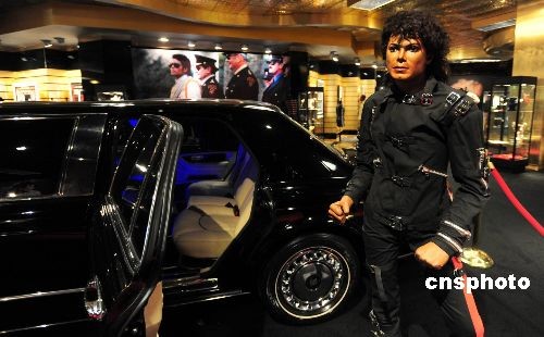 图为站在加长劳斯莱斯豪华轿车旁的杰克逊塑像。