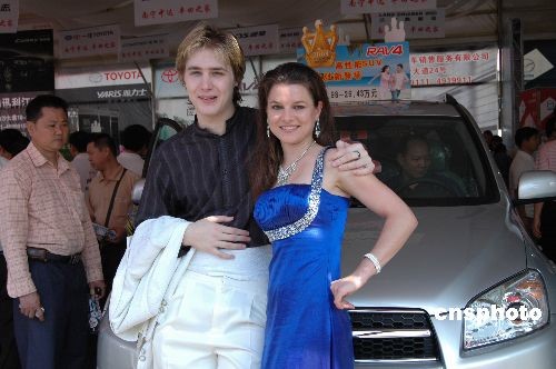 4月16日,广西汽车交易会现场,一对外国车模吸引众人目光。
