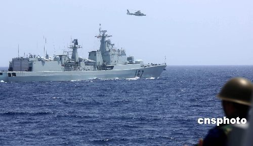 4月16日,中国海军第一、第二批护航编队在亚丁湾海域实施第二次共同护航。图为“深圳”号导弹驱逐舰舰载直升机起飞,执行空中护航巡逻、航拍任务。中新社发 孙自法 摄