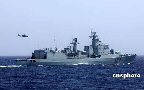 2009年4月16日,中国海军第一、第二批护航编队在亚丁湾海域实施第二次共同护航。图为“深圳”号导弹驱逐舰舰载直升机起飞,执行空中护航巡逻、航拍任务。中新社发 孙自法 摄