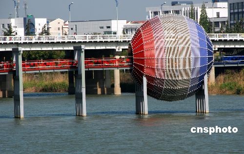 2009年4月17日,矗立于江苏淮安市区古淮河上的中国南北地理分界线标志的真容已全面显现。 标志物为一个微缩地球,位于红桥中间位置,也是河道中心线位置。球体分为南北两半球,北侧为渐变冷色调,南侧为渐变暖色调,寓意地球上的南北气候特征。据悉,标志园目前已进入峻工前的整理阶段,并定于今年五一节前正式对外开放。 中新社发 摄色红尘 摄
