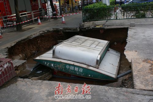 由于地下水管爆裂,冲刷泥土导致地下形成空洞,一个正在营业的邮政报刊亭瞬间沉入地下。昨日(4月17日)下午在深圳市罗湖区东门南路向西新村村口,正在报刊亭中聊天的报刊亭老板孙女士和其女儿连同来打公共电话的余小姐一起瞬间就陷入到这个长宽约4米、深约2米的水坑中,所幸事故没有人员伤亡。