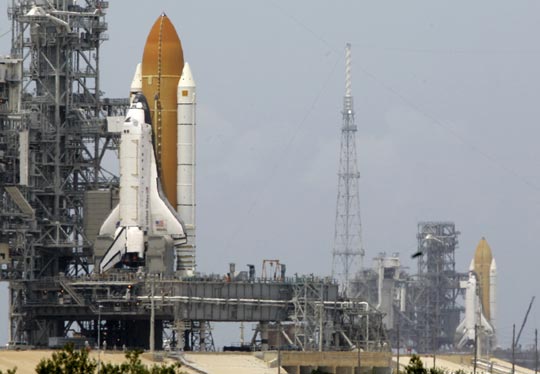 中新网4月18日电 当地时间4月17日,美国“奋进”号航天飞机(右)被送上佛罗里达州肯尼迪航天中心的发射台,与“阿特兰蒂斯”号(左)并肩矗立。5月12日,“阿特兰蒂斯”号升空后一旦出现意外,“奋进”号将前往营救。