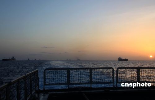 当地时间4月17日傍晚,中国海军首批护航编队在亚丁湾海域告别第二批护航编队。图为首批编队与共同护航的商船编队分航。中新社发 孙自法 摄