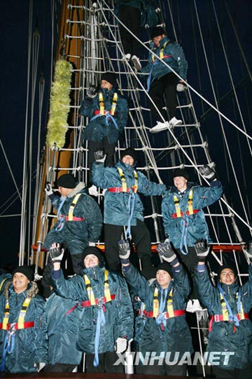 墨西哥海军“夸乌特莫克”号风帆训练舰驶入青岛港时,舰员们向欢迎人群致意。查春明 摄