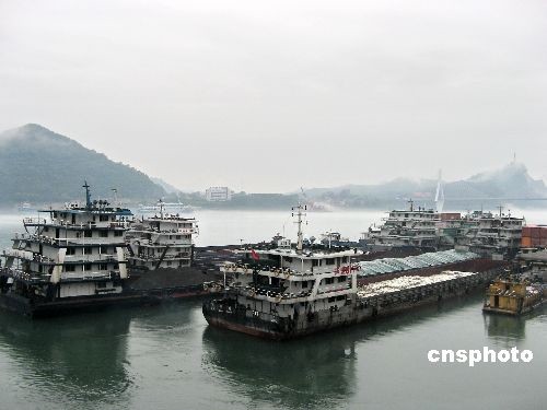 2009年4月19日,湖北宜昌港数十里江面,停泊着众多的客货轮,静待雾散适航后进峡。据悉,4月17日开始,长江三峡持续降雨产生大雾,三峡河段间断通航。中新社发 韩玉洪 摄