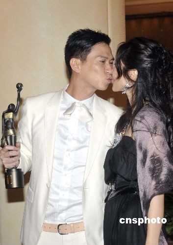 四月十九日晚,“第二十八届香港电影金像奖”颁奖典礼在香港文化中心大剧院举行,张家辉凭演出电影《证人》夺得最佳男主角奖项。图为张家辉在庆功酒会上与太太关咏荷亲吻。