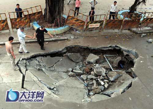 问起可能是什么原因引起的地陷,彭先生指着不远处的两辆泥头车说:“你去问问他们,他们应该知道。”彭先生说,从去年开始,每天晚上就会有几十辆超载的泥头车开过,路面上的很多窑井盖都被泥头车轧坏了。昨天凌晨1时左右,泥头车轰隆隆的声音搅得他难以入睡,突然传来“轰”的一声巨响,把他吓得从床上跳起来,“以为是地震呢!”彭先生跑到马路上,发现路面上出现了一个大窟窿。但也有居民表示,泥头车顶多把路面压坏,出现塌陷应该跟地质有关系。