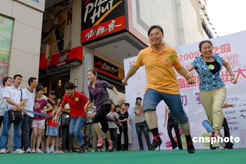 2009年4月19日,“2009梦之岛高跟鞋跑步大赛”在广西南宁市开赛。大赛设男子单项、女子单项、情侣赛等,比赛过程趣味横生。中新社发 彭寰 摄