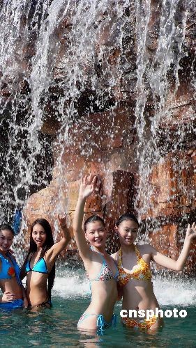 4月20日,在广东省清远市参加2009国际旅游小姐中国区总决赛的61名选手欢聚佛冈聚龙湾天然温泉度假村.佳丽们换上鲜艳的比基尼,一展美妙身姿。
