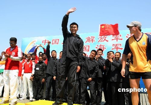 为庆祝中国人民解放军海军成立60周年,多国海军4月21日在青岛隆重举行舢板比赛,来自法国、俄罗斯、韩国及东道主中国等12个国家13支代表队参加了比赛,中国海军队获得第一名。