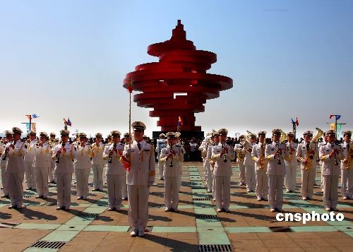 庆祝中国人民解放军海军成立60周年多国海军活动,4月21日在青岛“五四”广场举行“欢乐的海洋”军乐队联合演出,韩国、俄罗斯、印度、美国、孟加拉、巴西来访舰艇乐队和中国海军军乐队、北海舰队军乐队参加了联欢演出。中新社发 宋吉河 摄