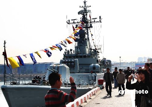 图:“海口”舰国旗军旗迎风招展庆祝海军60华诞