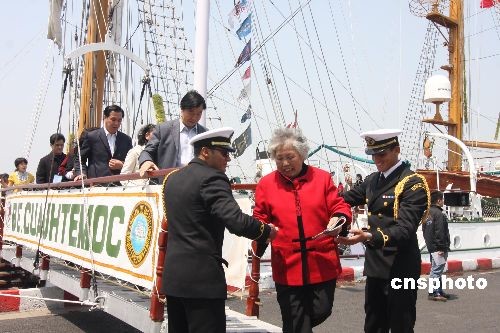 4月22日,纪念中国人民解放军海军成立60周年多国海军军舰开放日活动在山东省青岛港码头举行。图为在墨西哥海军“夸乌特莫克”号风帆训练舰靠岸处,该国海军官兵扶一名老妇人安全下军舰。中新社发 郭国权 摄