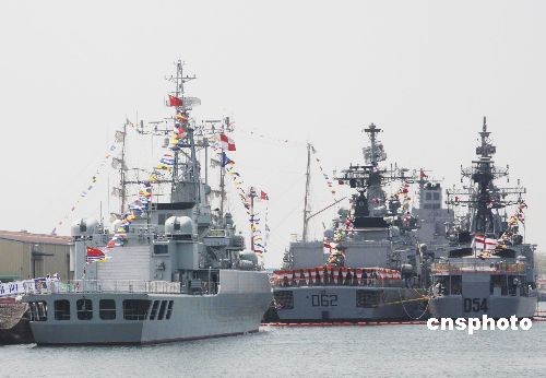 4月22日,纪念中国人民解放军海军成立60周年多国海军军舰开放日活动在山东省青岛港码头举行。图为停靠在青岛港的多国军舰。中新社发 郭国权 摄