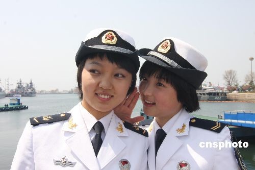 4月22日,纪念中国人民解放军海军成立60周年多国海军军舰开放日活动在山东省青岛港码头举行。图为两名中国海军女兵在参观外国军舰时开心交流。中新社发 郭国权 摄