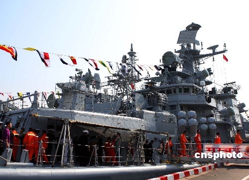 参加庆祝中国人民解放军海军成立60周年多国海军活动的各国舰艇停靠在解放军海军码头,4月22日各国海军官兵相互登舰参观,同时各国舰艇对青岛市民开放,青岛军港一派祥和欢乐气氛。中新社发 宋吉河 摄