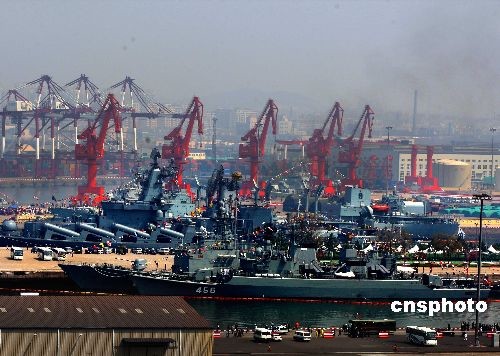 4月22日,停靠在青岛解放军海军码头参加庆祝中国人民解放军海军成立60周年多国海军活动的各国舰艇,各国海军官兵相互登舰参观,同时各国舰艇对青岛市民开放,让众多各界人士在参观中大开眼见。图为多国海军舰艇停靠青岛军港。中新社发 宋吉河 摄