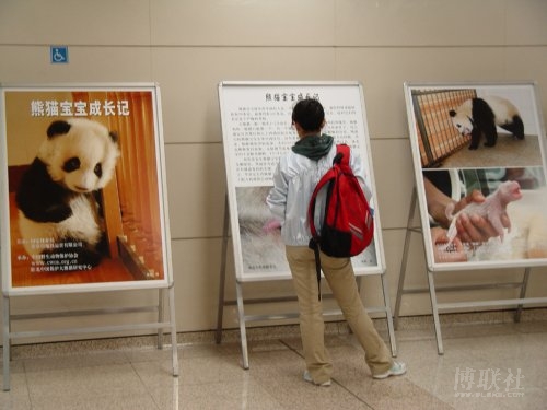 2009年4月22日,一个别开生面的“熊猫宝宝成长记”摄影展在北京地铁五号线的五个站厅-天坛东门、磁器口、灯市口、和平里北街、和平西桥开幕,展期一个半月。此次影展由国家林业局和北京市地铁运营有限公司主办,由中国野生动物保护协会和卧龙中国保护大熊猫研究中心共同承办。(罗小韵)