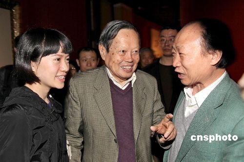 4月23日,杨振宁、翁帆夫妇二人冒雨来到北京中国美术馆光观看在这里举行的“高山景行——冯大中艺术展”。杨振宁夫妇在著名画家冯大中的陪同下仔细观看了每幅画作,对冯大中笔下栩栩如生的虎图赞赏不已,杨振宁对画家取得的艺术成就给予了高度评价。中新社发 王保胜 摄