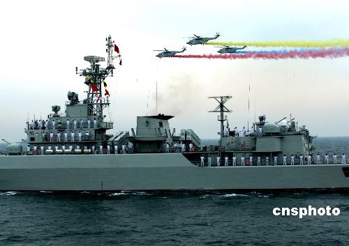 中国历史上的首次多国海军检阅活动四月二十三日下午在青岛附近黄海海域举行。中国国家主席、中央军委主席胡锦涛乘阅兵舰“石家庄”号导弹驱逐舰,检阅中国海军的潜艇、水面舰艇、海军航空兵和海军陆战队等作战兵种,并检阅了来访的十四个国家的二十一艘舰艇。中新社发 宋吉河 摄