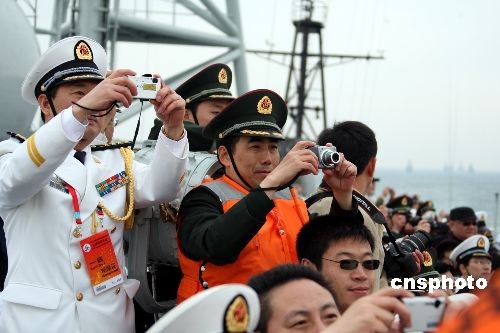 4月23日,为纪念中国人民解放军海军成立60周年而举行的海上阅兵在青岛附近黄海海域举行。图为中国军官关注海上阅兵式。中新社发 张雷 摄