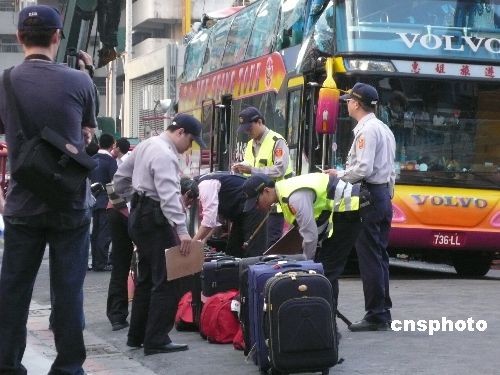 大陆广东东莞旅游团一行二十五人四月二十四日下午一时五十四分左右到台北一0一大楼附近参访,游览车行经松高路,一处工地起重机吊臂从高空掉落,砸中游览车尾部,造成二人死亡。中新社发 邓敏 摄