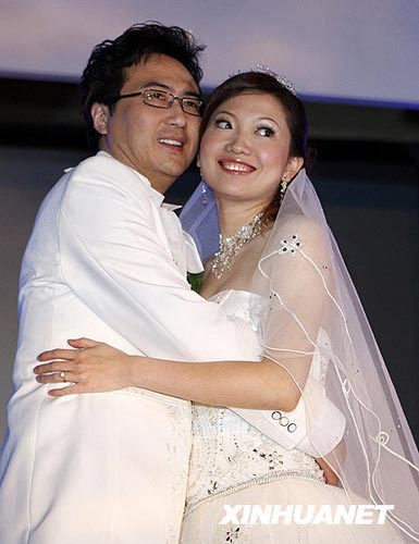 4月25日,新加坡乒乓女将李佳薇(右)和丈夫李超在婚礼典礼上深情相拥。(王丽莉摄)