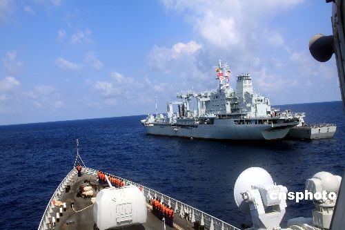 2009年4月25日,中国海军首批护航编队返航驶出新加坡海峡,在阿南巴斯群岛西南预定海域与“青海湖”号综合补给舰顺利会合,三舰进行靠帮补给,这也是首批护航编队最后一次海上补给。中新社发 孙自法 摄