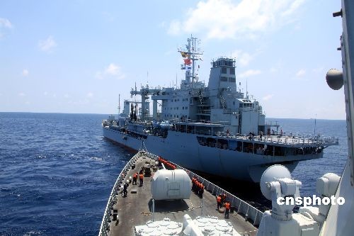 2009年4月25日,中国海军首批护航编队返航驶出新加坡海峡,在阿南巴斯群岛西南预定海域与“青海湖”号综合补给舰顺利会合,三舰进行靠帮补给,图为“海口”舰与“青海湖”舰完成靠帮补给后分航。中新社发 孙自法 摄