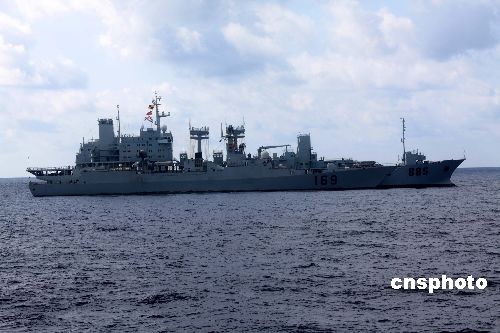 2009年4月25日,中国海军首批护航编队返航驶出新加坡海峡,在阿南巴斯群岛西南预定海域与“青海湖”号综合补给舰顺利会合,三舰进行靠帮补给,图为“武汉”舰与“青海湖”舰先行靠帮。中新社发 孙自法 摄