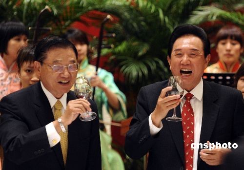 四月二十五日晚,海协会在南京紫金山庄设宴欢迎海基会一行。江丙坤致辞结束与陈云林碰杯时一饮而尽。中新社发 廖攀 摄