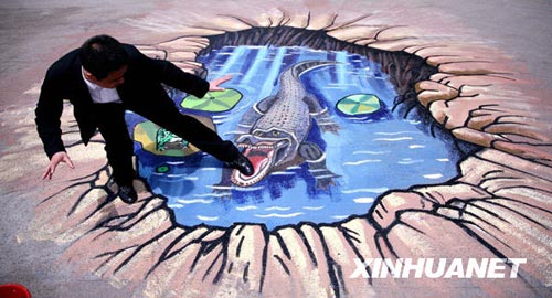 一名男士将脚伸进“鳄鱼”口中。(王新 摄)