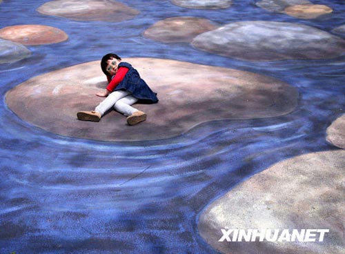 一名小朋友在“池塘”中的一块“石头”上拍照留念。(王新 摄)