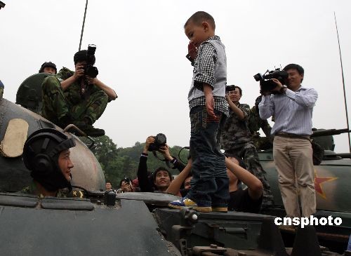 4月25日,汶川大地震幸存者“敬礼娃娃”郎峥一家来到成都军区驻渝某部营区,感谢该部战士在废墟中救出郎峥的性命。2008年5月13日晨,3岁的郎峥被解放军官兵从废墟里救出后,躺在一块小木板做的临时担架上,用他稚嫩的右手向8位抬着他的解放军叔叔敬了个少先队礼,他的举动引起社会各界高度关注,被媒体称为“敬礼娃娃”。图为郎峥在营区内见到梦寐以求的坦克,爬到坦克车上用一个军礼向解放军叔叔表示感谢。中新社发 郭晋嘉 摄