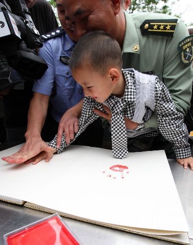 4月25日,汶川大地震幸存者“敬礼娃娃”郎峥一家来到成都军区驻渝某部营区,感谢该部战士在废墟中救出郎峥的性命。2008年5月13日晨,3岁的郎峥被解放军官兵从废墟里救出后,躺在一块小木板做的临时担架上,用他稚嫩的右手向8位抬着他的解放军叔叔敬了个少先队礼,引起社会各界高度关注,被媒体称为“敬礼娃娃”。图为郎峥在该部队留言簿上留下自己的掌印。中新社发 郭晋嘉 摄
