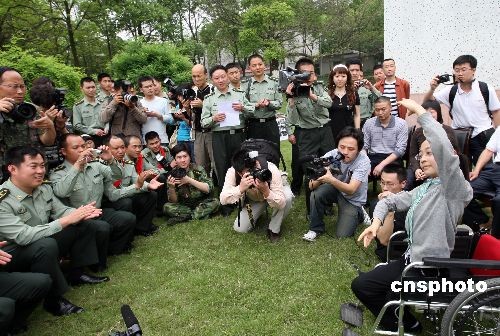 4月25日,“芭蕾女孩”李月在母亲的陪护下来到成都军区驻渝某部营区,看望感谢在去年地震中将她救出的解放军。李月,11岁,汶川大地震70多个小时后获救,失去了左腿。她在北京2008年残奥会开幕式上,与芭蕾王子吕萌和上百名聋哑演员完美演出《永不停跳的舞步》,感动了世界。图为李月为在场的解放军官兵表演舞蹈。中新社发 郭晋嘉 摄